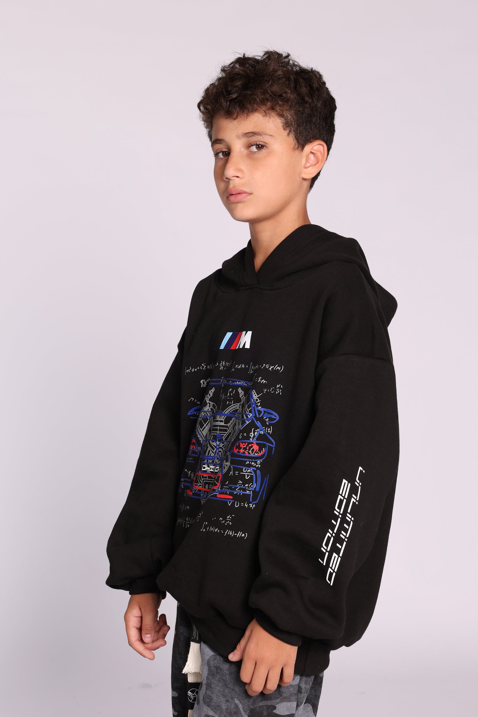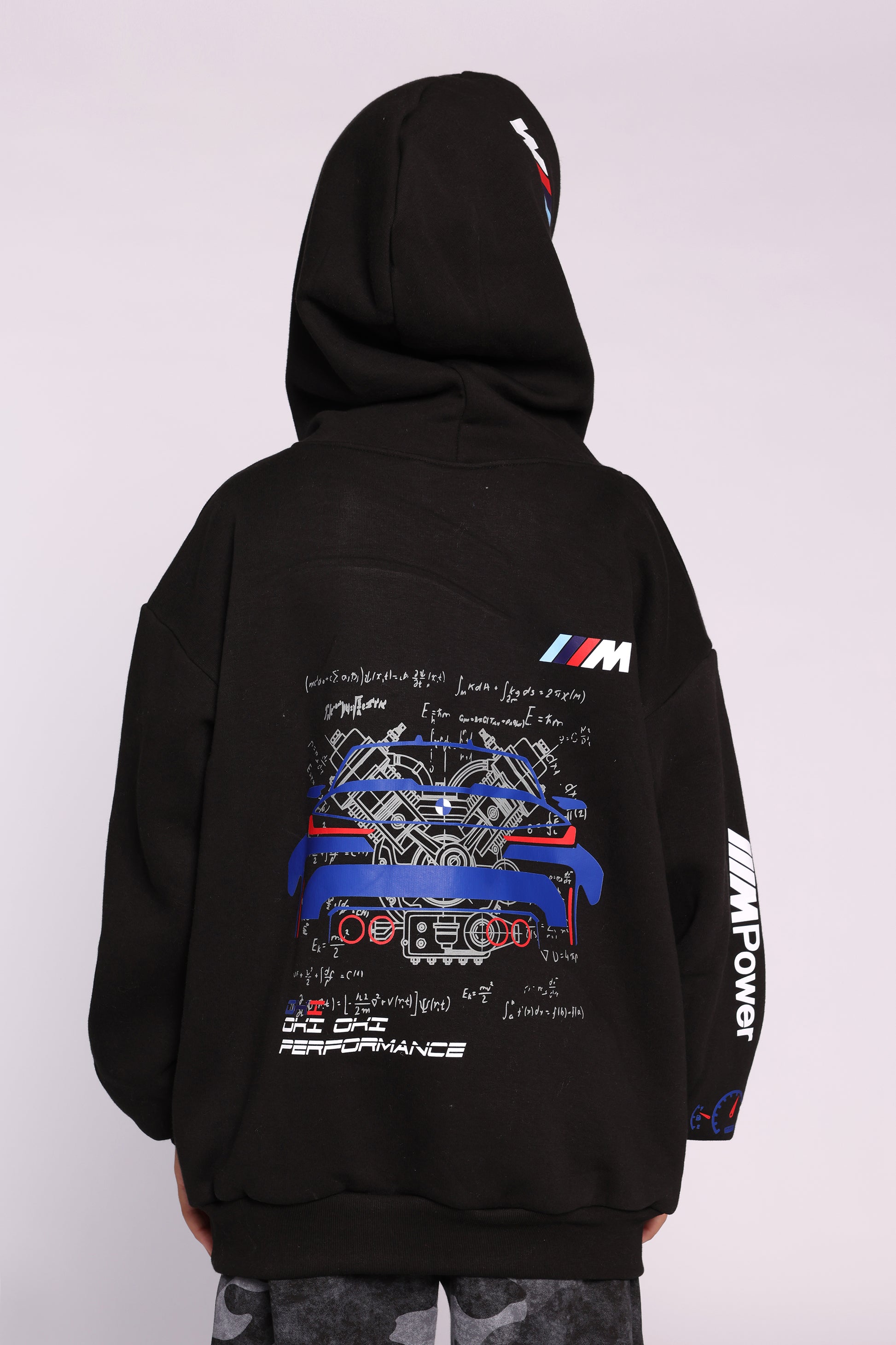 - Oversized black hoodie featuring a detailed engine blueprint graphic